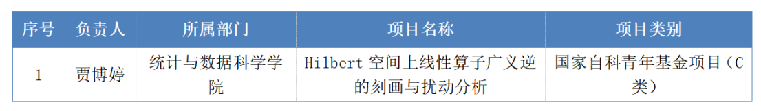 近日,2025年度国家自然科学基金委员会与全国哲学社会科学工作办公室陆续公示立项结果,我校有6个国家“两金”项目拟获立项。其中,我院贾博婷教授牵头申报的《Hilbert空间上线性算子广义逆的刻画与扰动分析》项目,成功入选国家自然科学基金C类项目。此次国家自科重大项目获批立项为我校在数学与算子理论等优势研究方向的深化发展注入新动能,进一步夯实了学科科研基础,对提升我校相关领域的学术影响力具有积极意义。